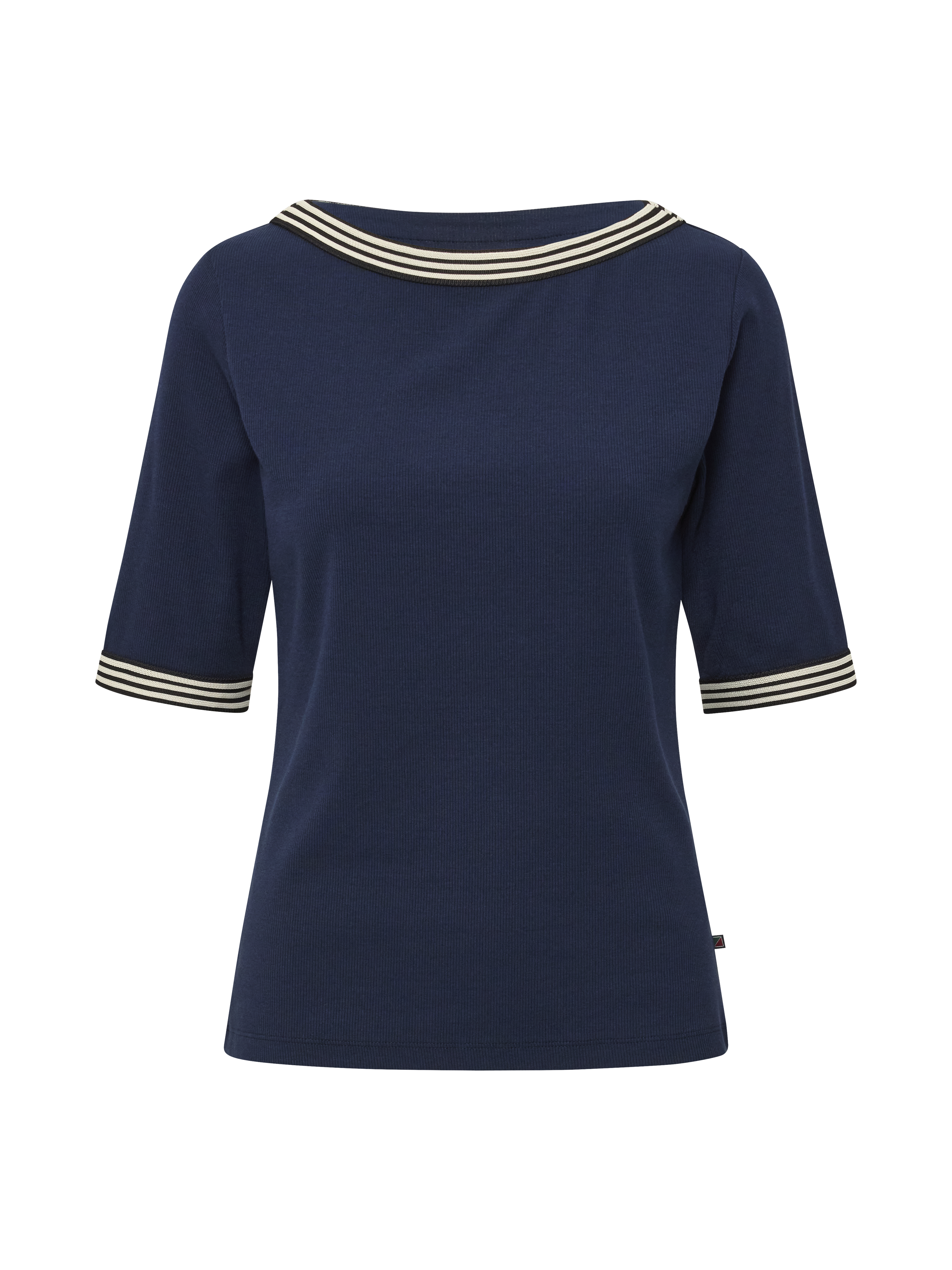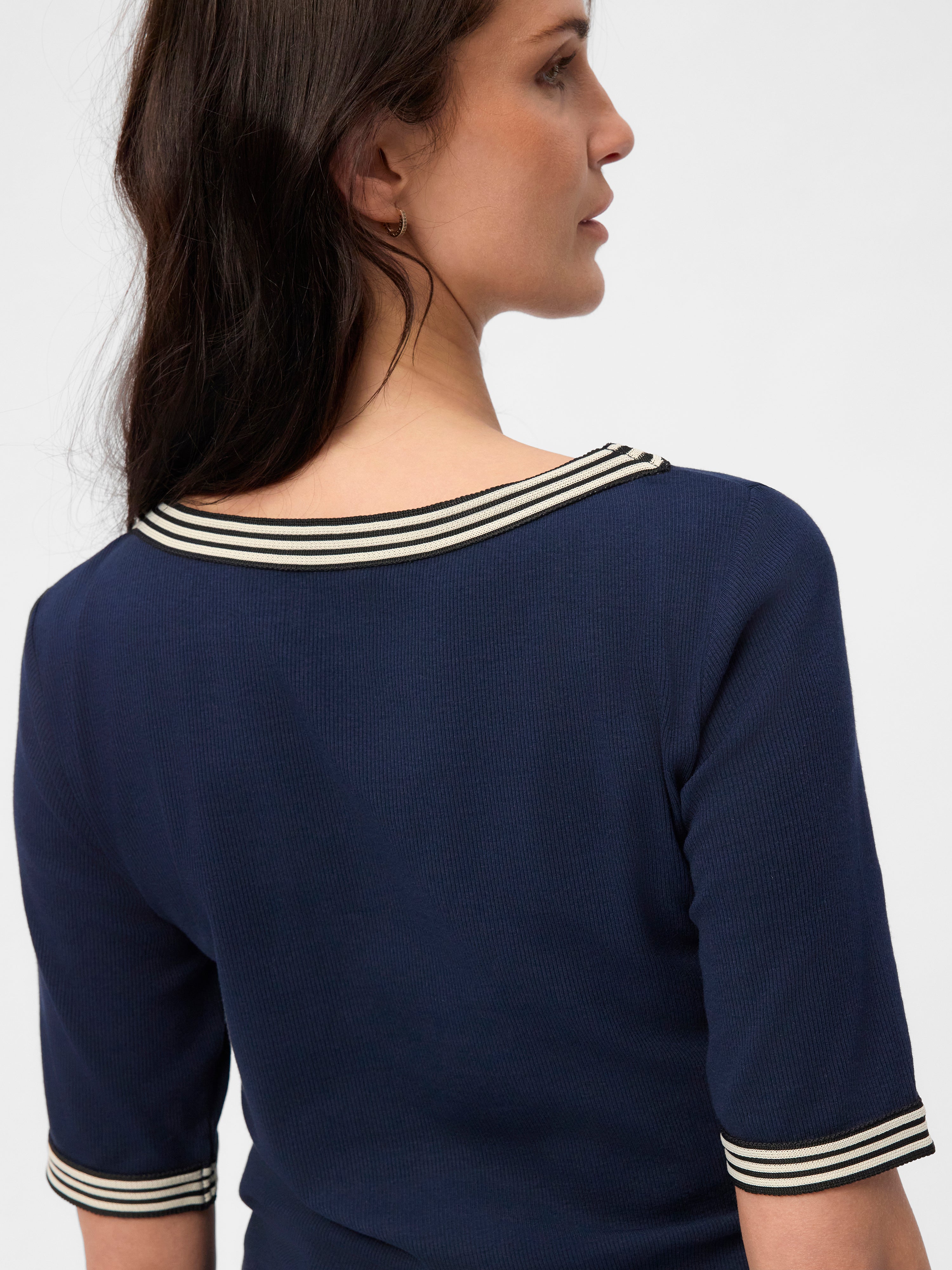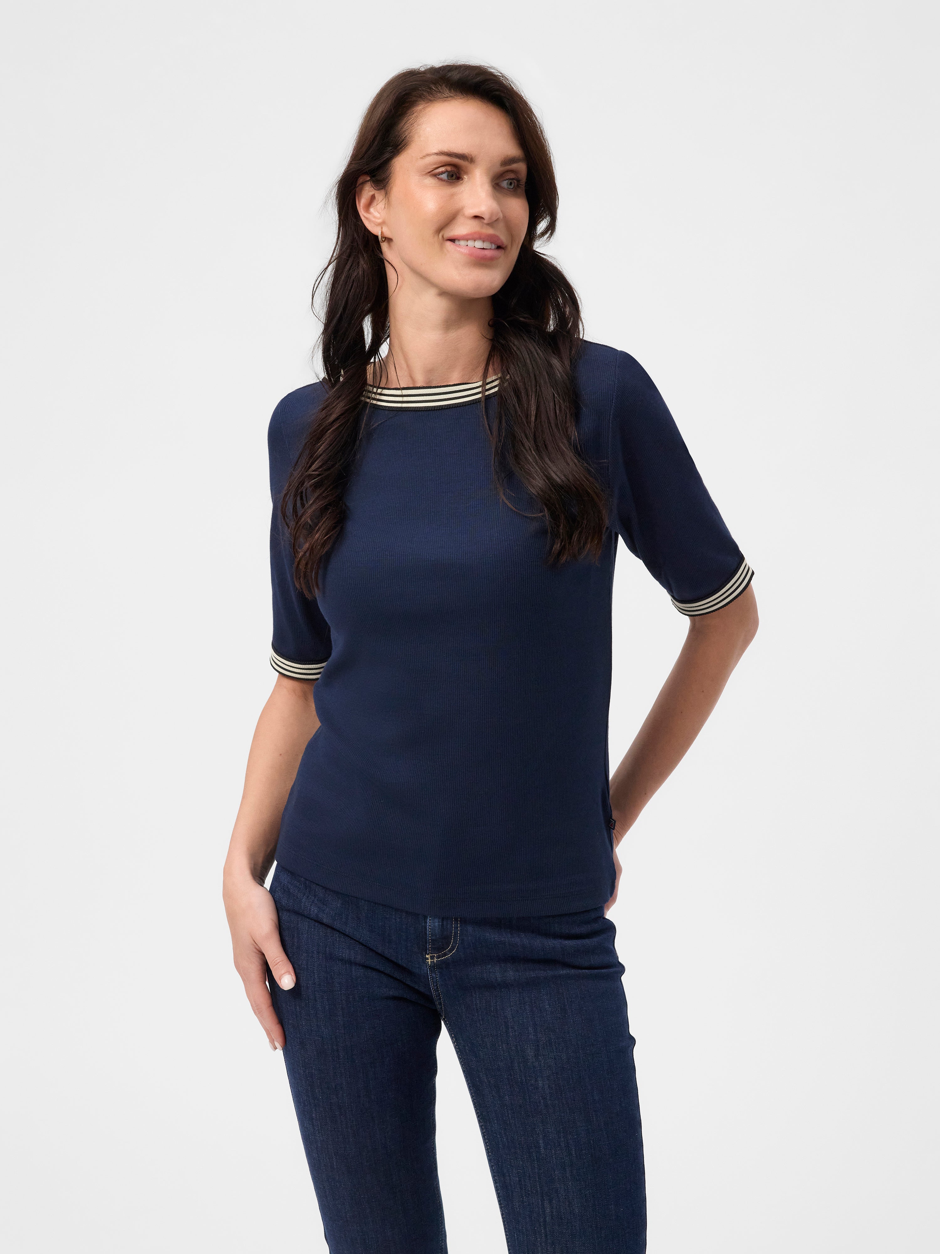 Elegant og komfortabel T-shirt med fine kontrastdetaljer, fremstillet i en blød og strækbar kvalitet. En alsidig T-shirt, der fungerer både til hverdag og mere pæne anledninger.