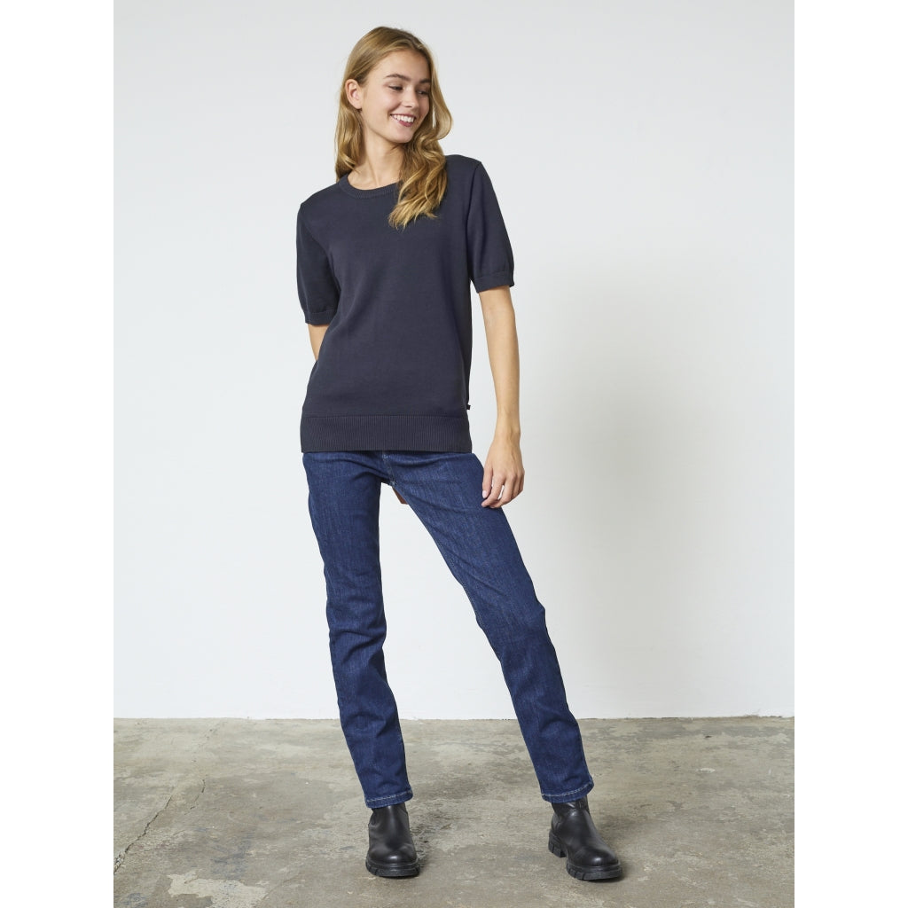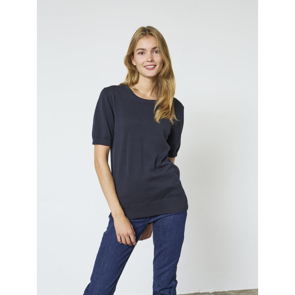 En enkel og tidløs kortærmet strik. Den rene silhuet og bløde kvalitet giver et raffineret udtryk, der fungerer både alene og under en jakke eller cardigan.
