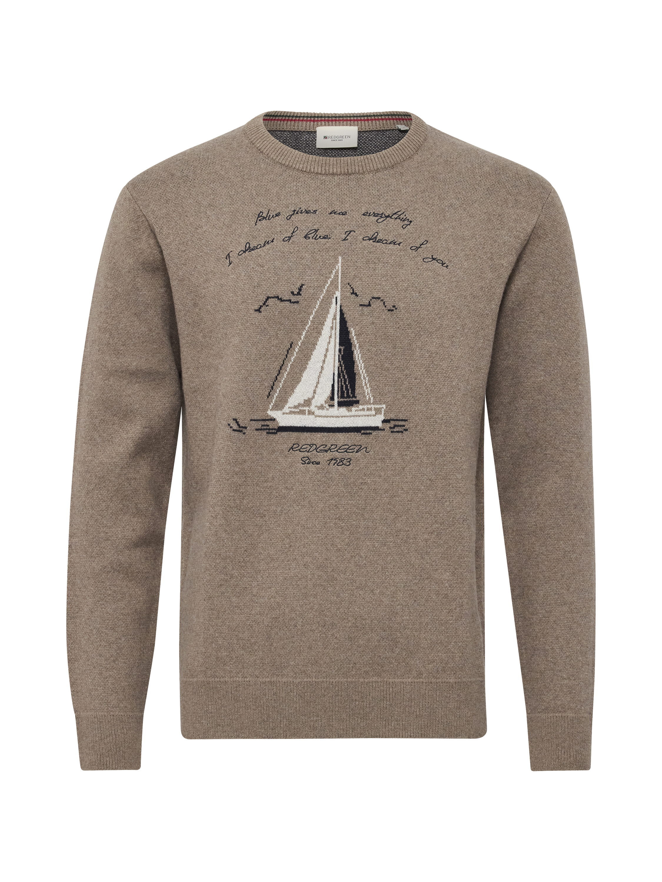 Jakob er en maritim inspireret strik med broderet sejlmotiv foran. Den bløde bomulds- og uldblanding gør den behagelig at have på – perfekt til et afslappet, men pænt look.