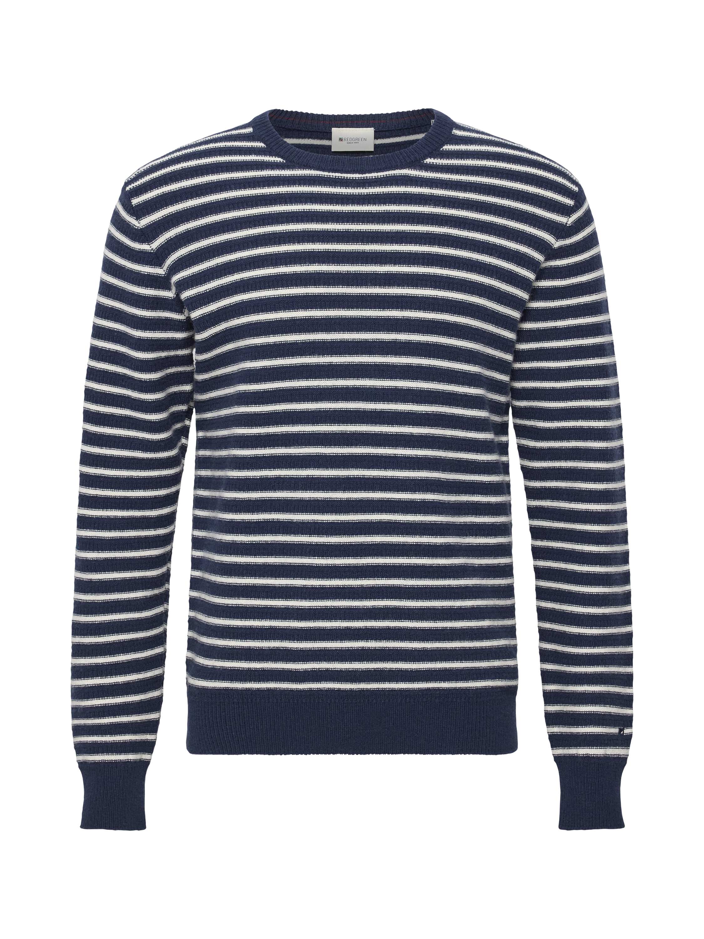 Jeter er en stribet strik i en blød uld- og bomuldsblanding. Den har rund hals og en klassisk pasform – nem at style og god som et varmt lag i hverdagen.