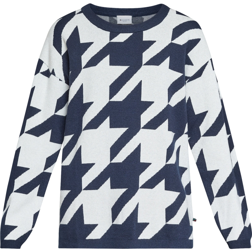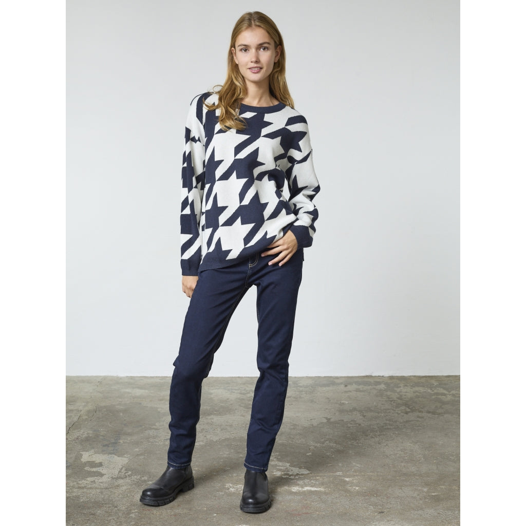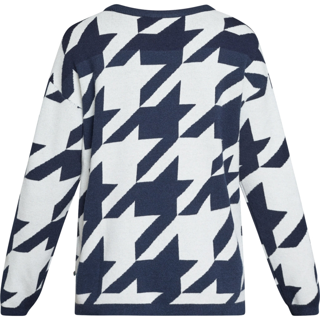 En klassisk strik i en moderne udgave. Denne trøje er designet med et markant hundetandsmønster i beige og hvid, som giver et grafisk og stilrent udtryk. Med rund hals, lange ærmer og en behagelig pasform er den både komfortabel og nem at style til hverdag.