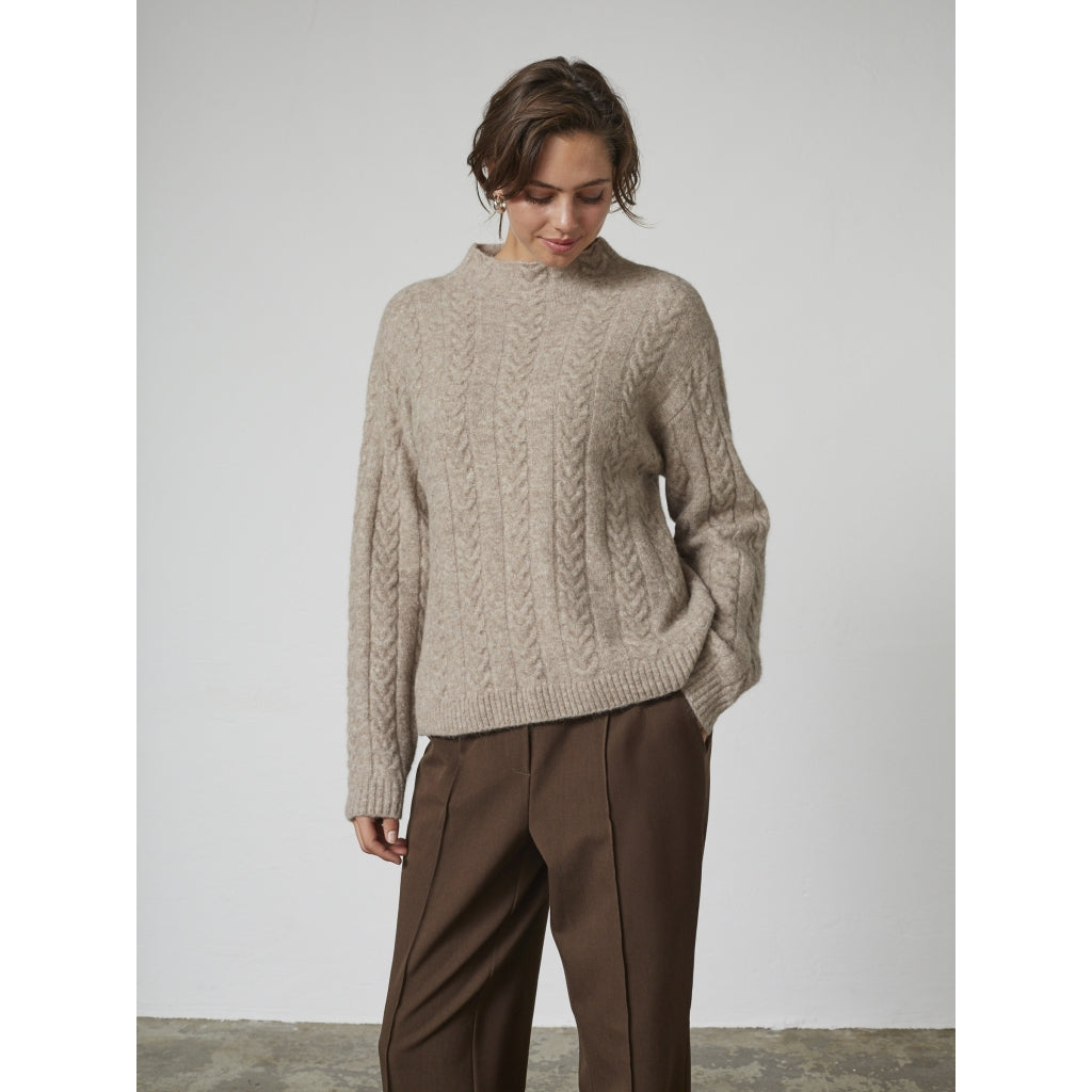Katey er en blød kabelstrik med høj hals og klassisk struktur. Den varme alpaka- og merinoblanding gør den oplagt til kølige dage – behagelig og stilren på én gang.