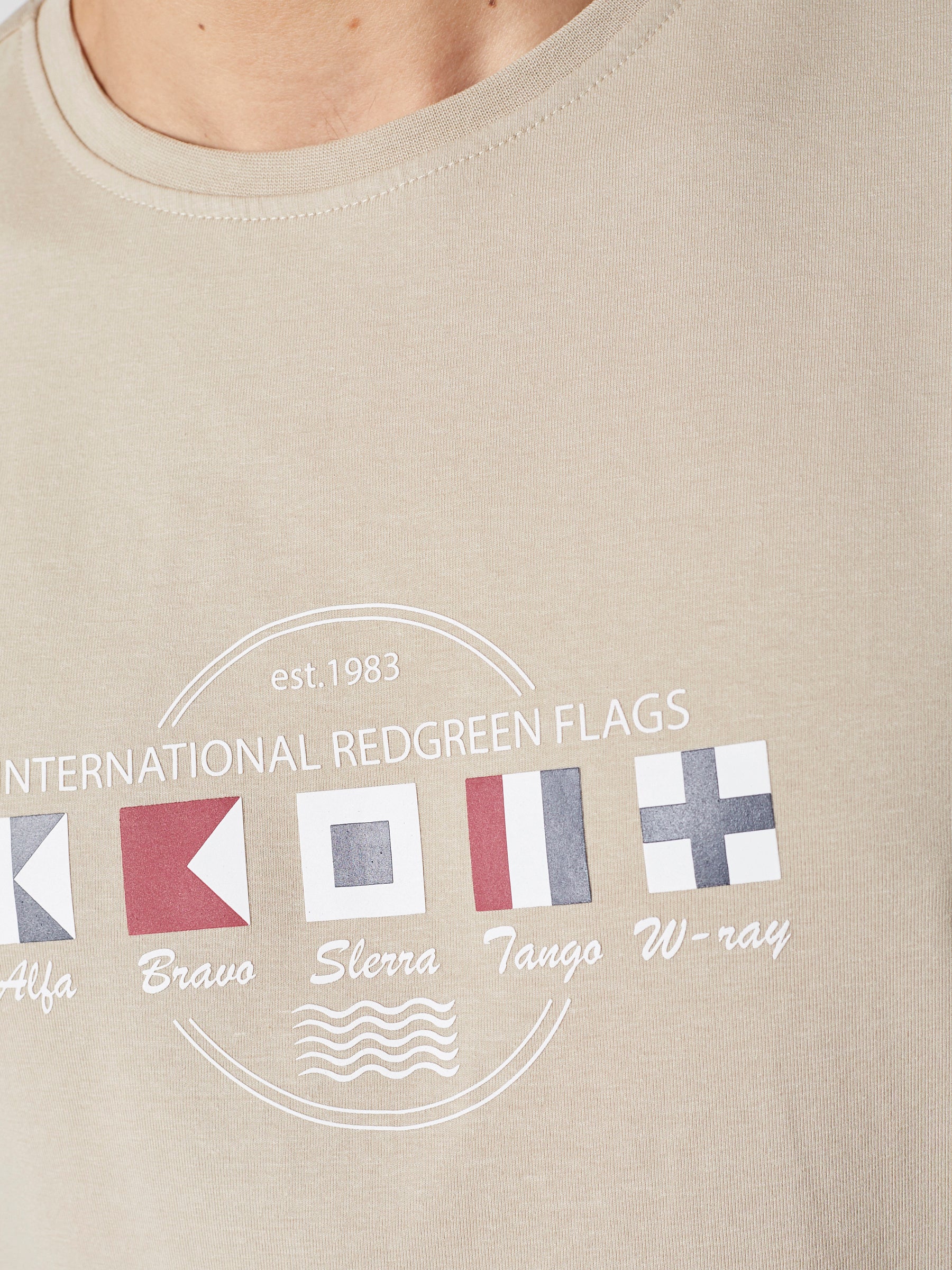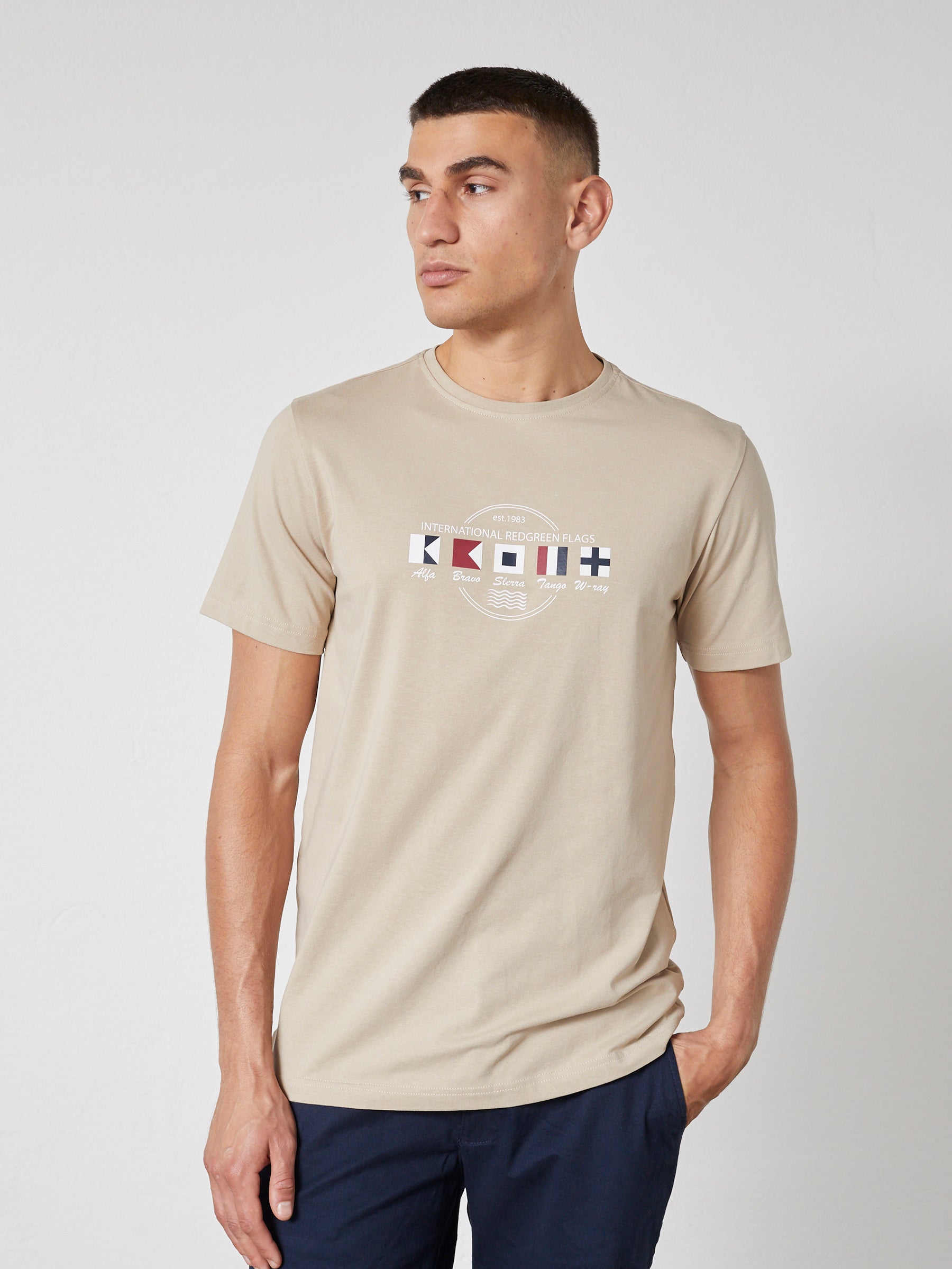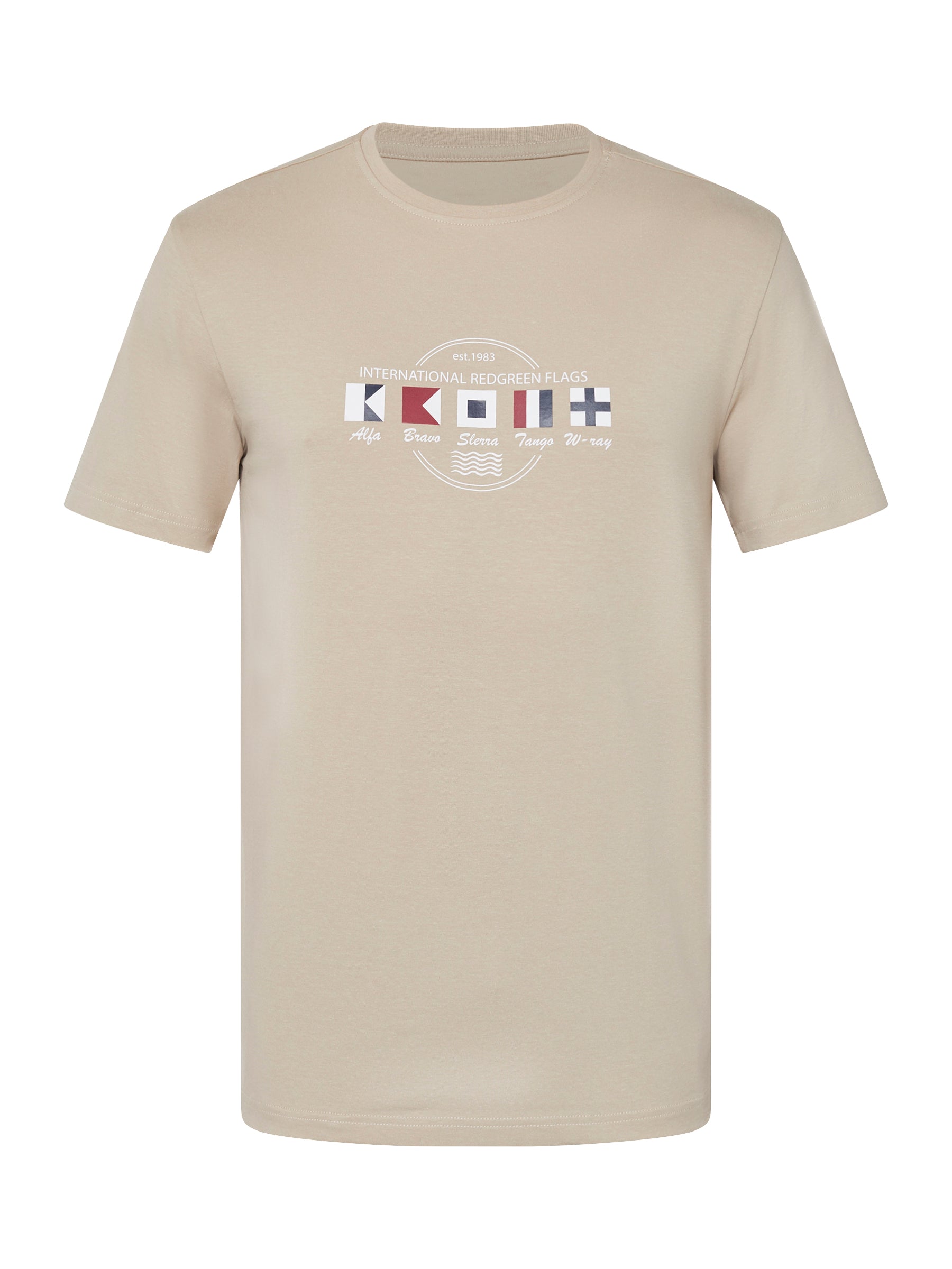 Afslappet herre-T-shirt i blød bomuldsblanding med stræk og et grafisk frontprint med maritim reference. Den komfortable kvalitet og fleksible pasform gør T-shirten velegnet til hverdagsbrug og afslappede fritidslooks.