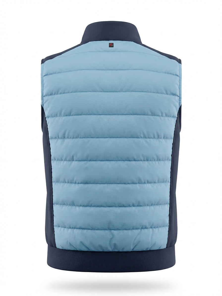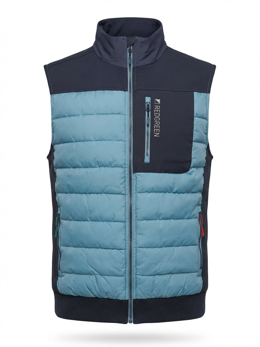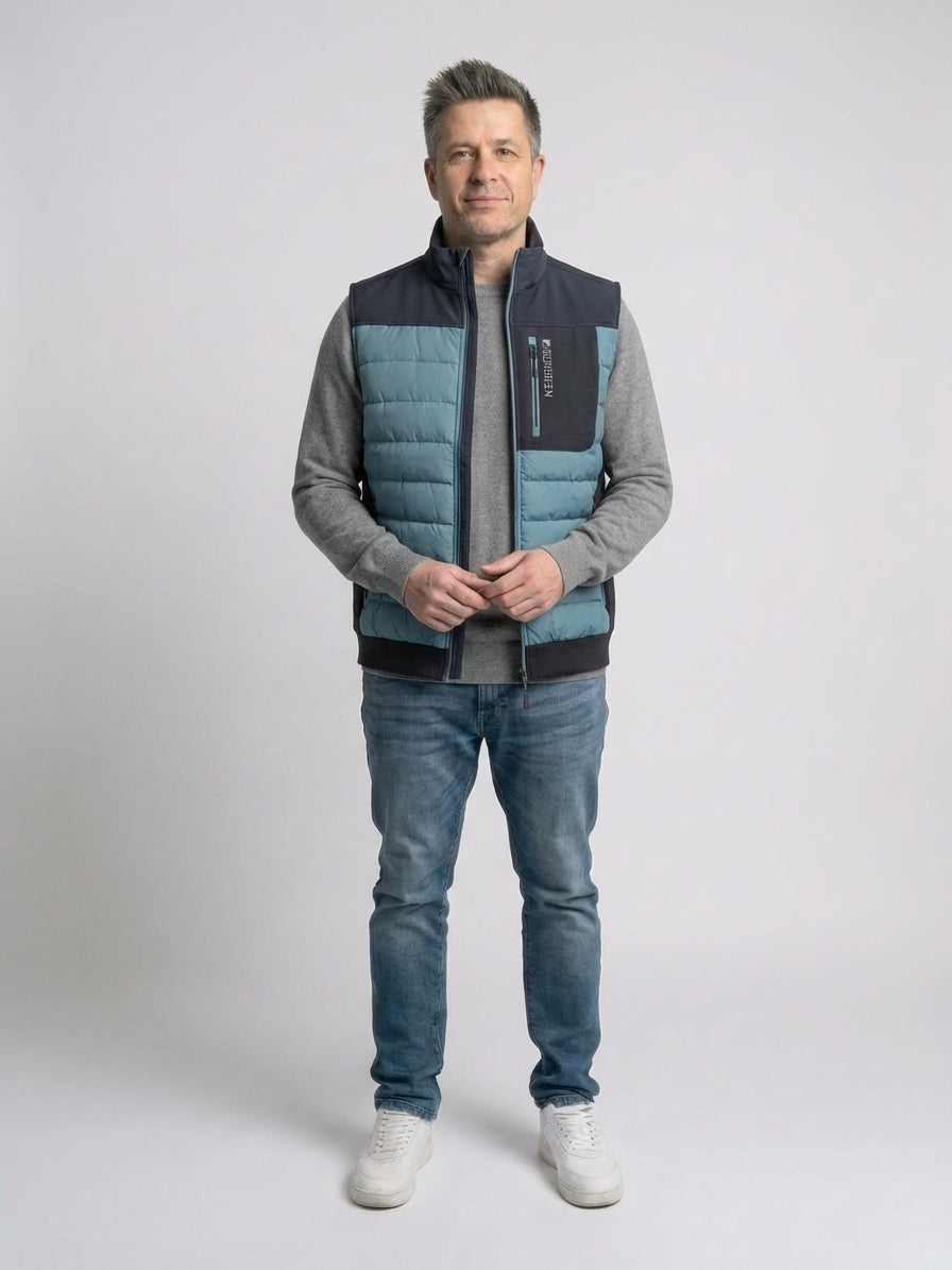 Let og funktionel quiltet vest i 100% polyester med ståkrave og lynlåslukning. Et praktisk mellemlag til skiftende vejr med et enkelt, maritimt udtryk.