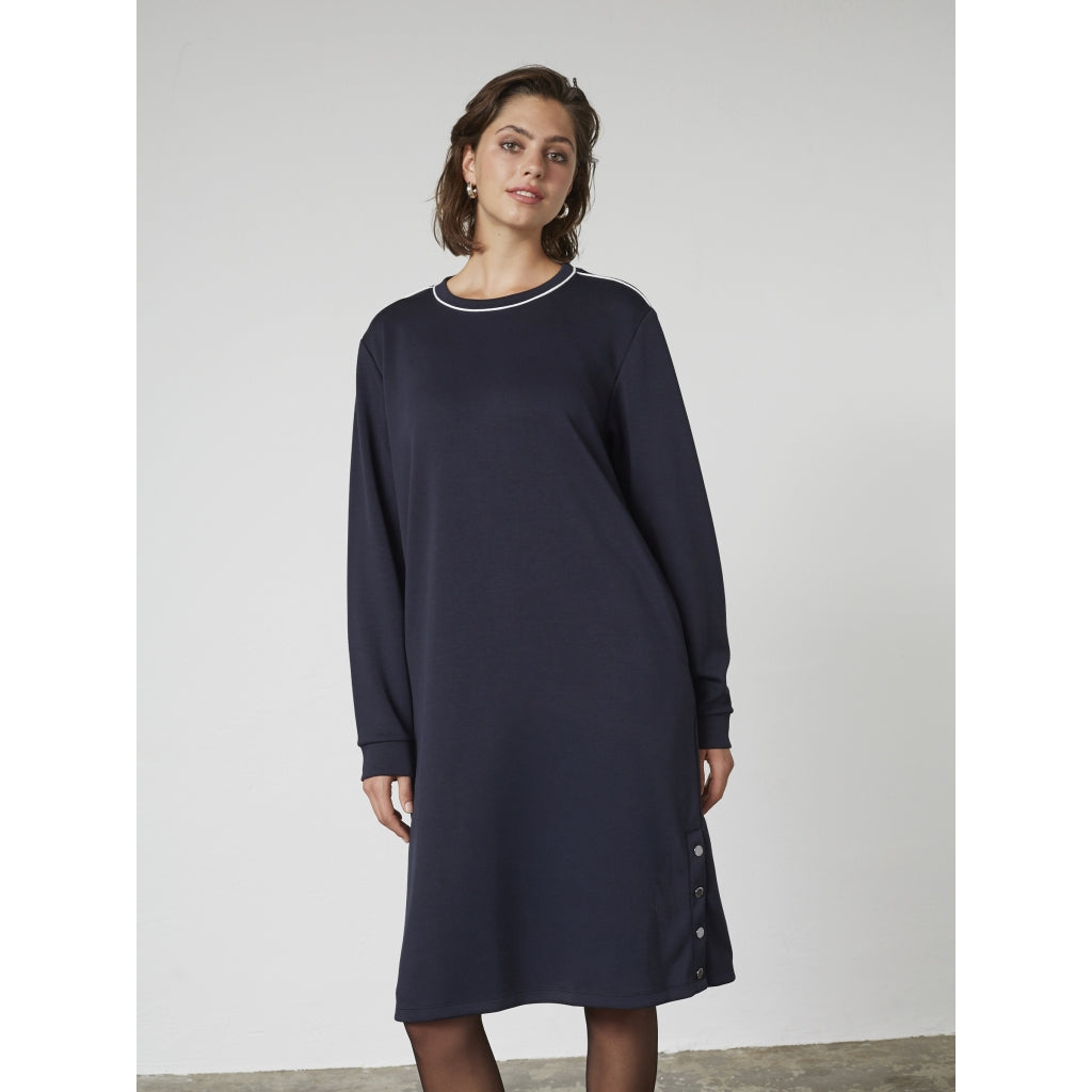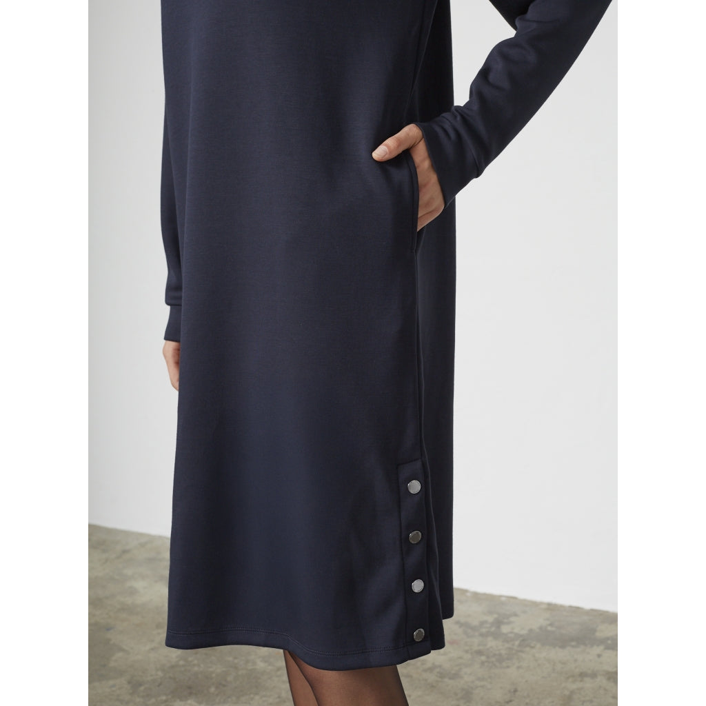 • En enkel og blød sweatkjole med rund hals og lange ærmer. Den afslappede pasform giver bevægelsesfrihed og komfort, mens detaljen i siden tilføjer et diskret løft. En hverdagsfavorit, der fungerer året rundt.