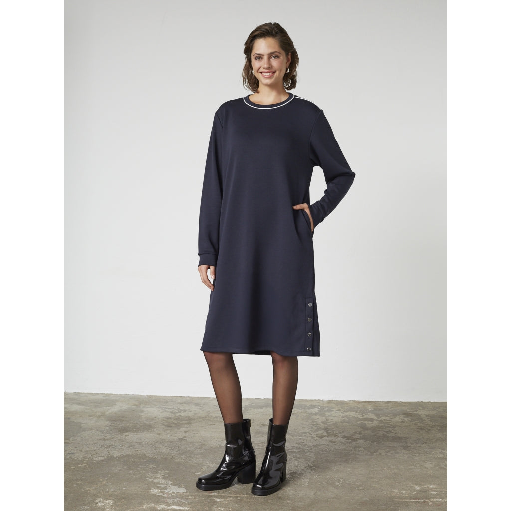 En enkel og blød sweatkjole med rund hals og lange ærmer. Den afslappede pasform giver bevægelsesfrihed og komfort, mens detaljen i siden tilføjer et diskret løft. En hverdagsfavorit, der fungerer året rundt.