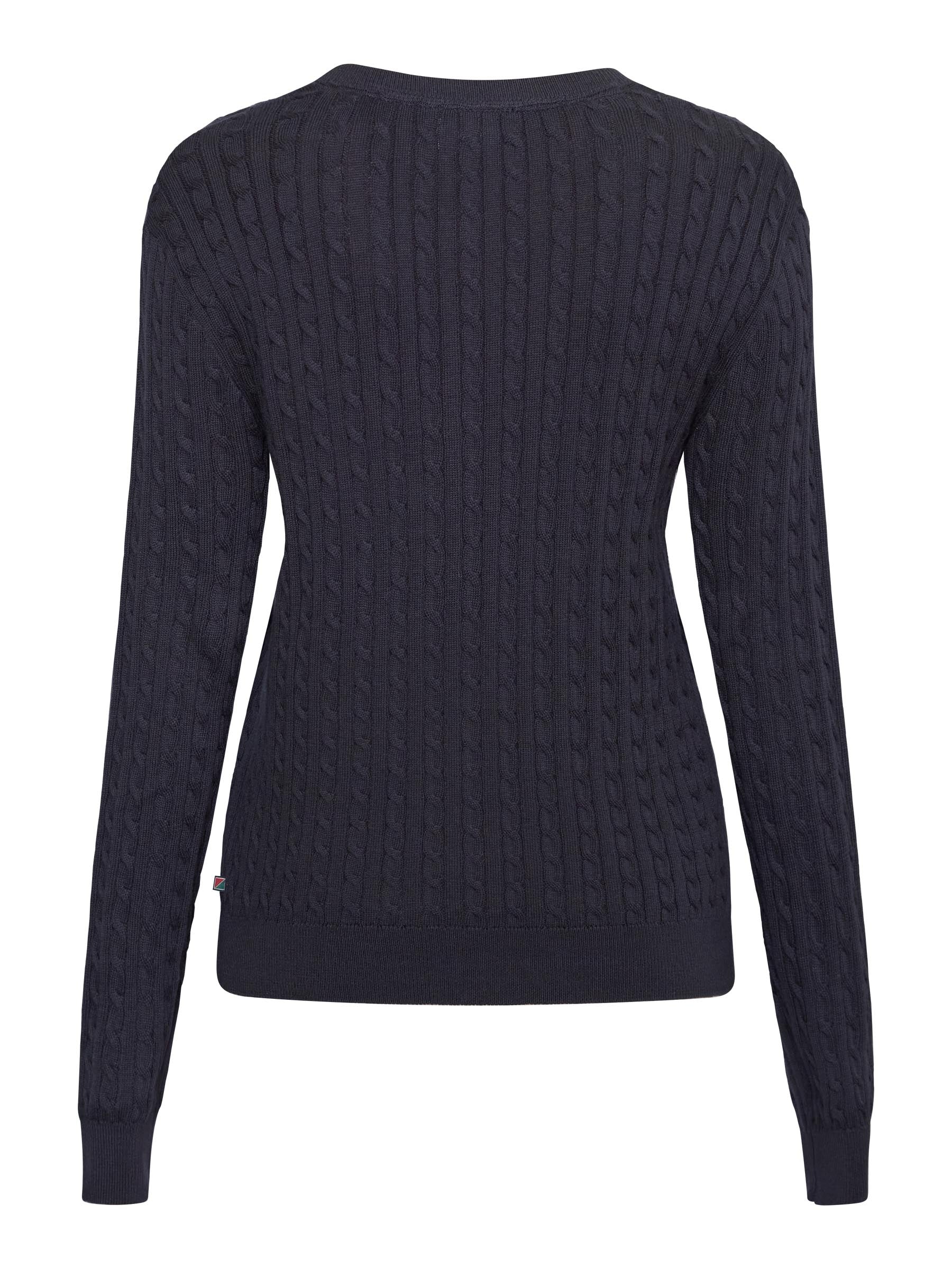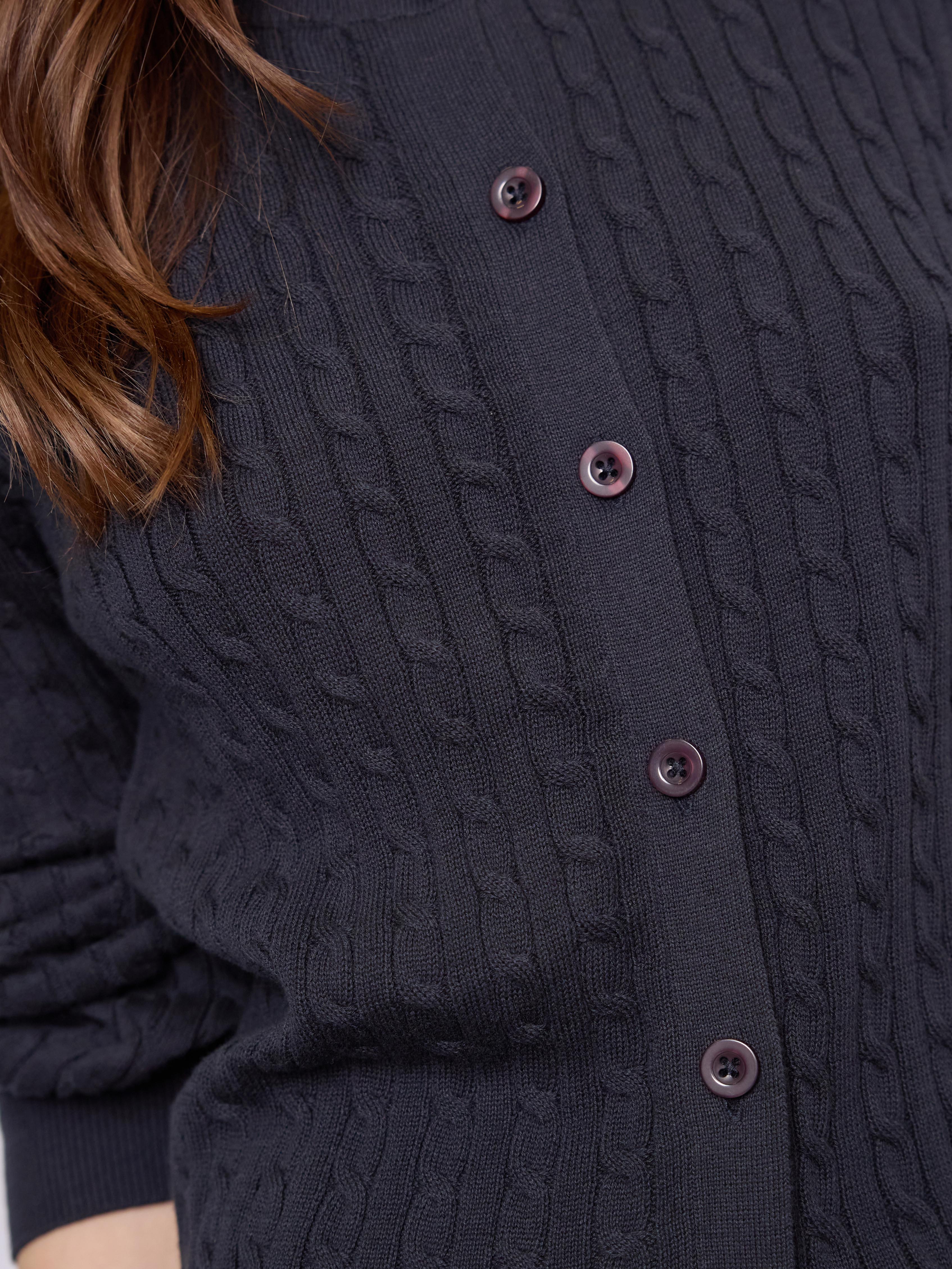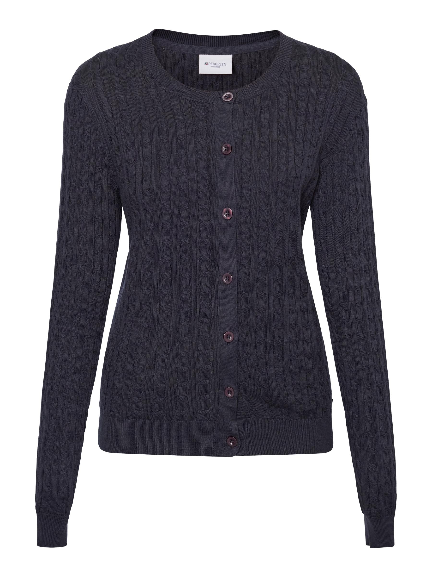 Klassisk strikket cardigan i 100% økologisk bomuld med et tidløst kabelstriksmønster og et feminint udtryk. Cardiganen har lange ærmer, knaplukning foran og en rund halsudskæring, der gør den nem at style både til hverdag og arbejde.