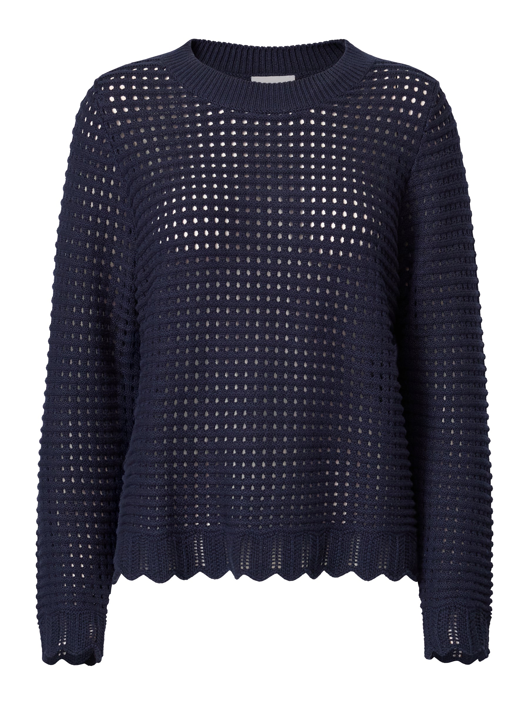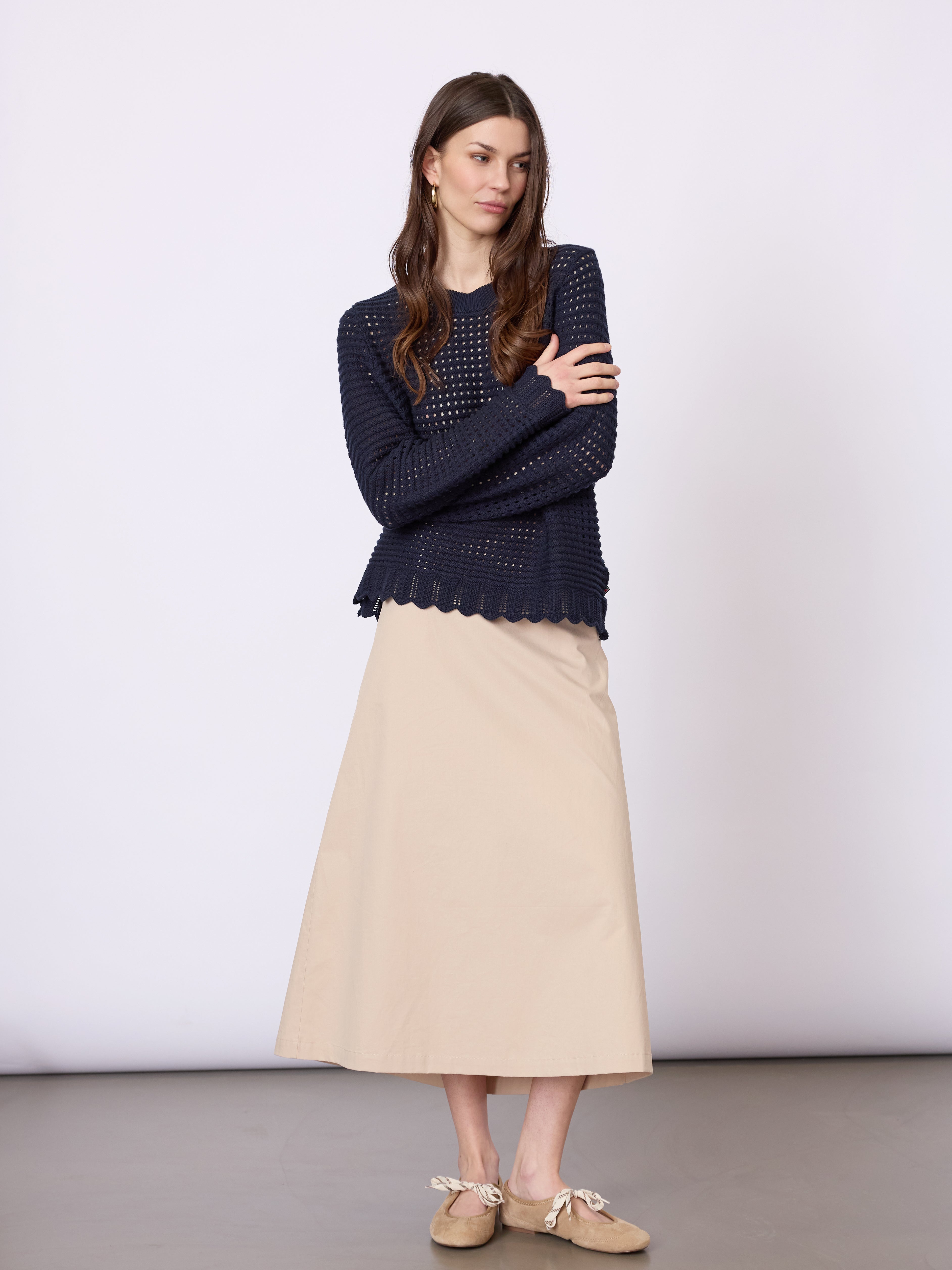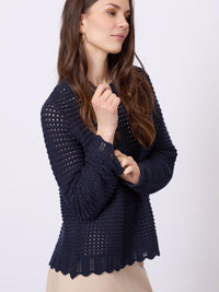 Let og struktureret striktrøje i 100% økologisk bomuld med et luftigt hulmønster og et afslappet, feminint udtryk. Den bløde kvalitet og den klassiske pasform gør den velegnet til både hverdag og lag-på-lag.