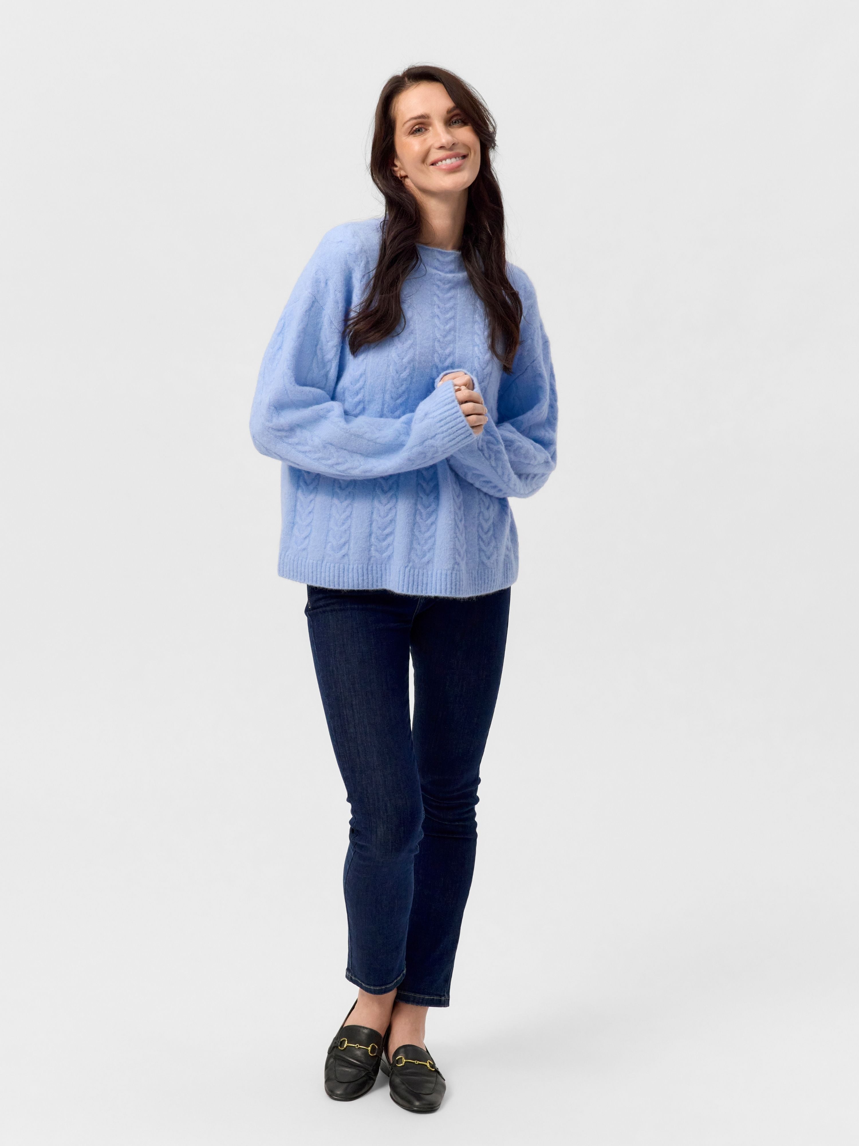 Katey er en blød kabelstrik med høj hals og klassisk struktur. Den varme alpaka- og merinoblanding gør den oplagt til kølige dage – behagelig og stilren på én gang.